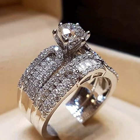 Caoshi Nieuwe Messing Sieraden Simulatie Diamant Grote Diamant Cz Zirkoon Zilverachtige Ringen Vrouwelijke Verloving Bruiloft Bruidsring Sets Vrouwen